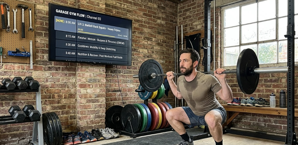 - Garage Gym Flow — warm-up, lift, finisher, cooldown, programmed as a single continuous session.