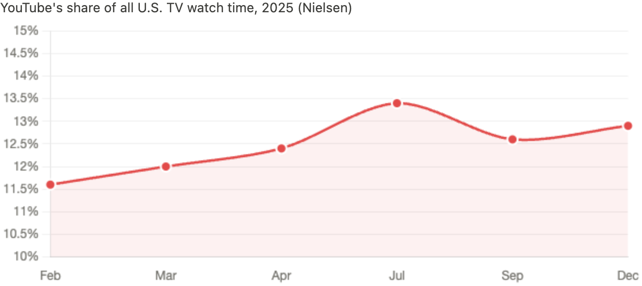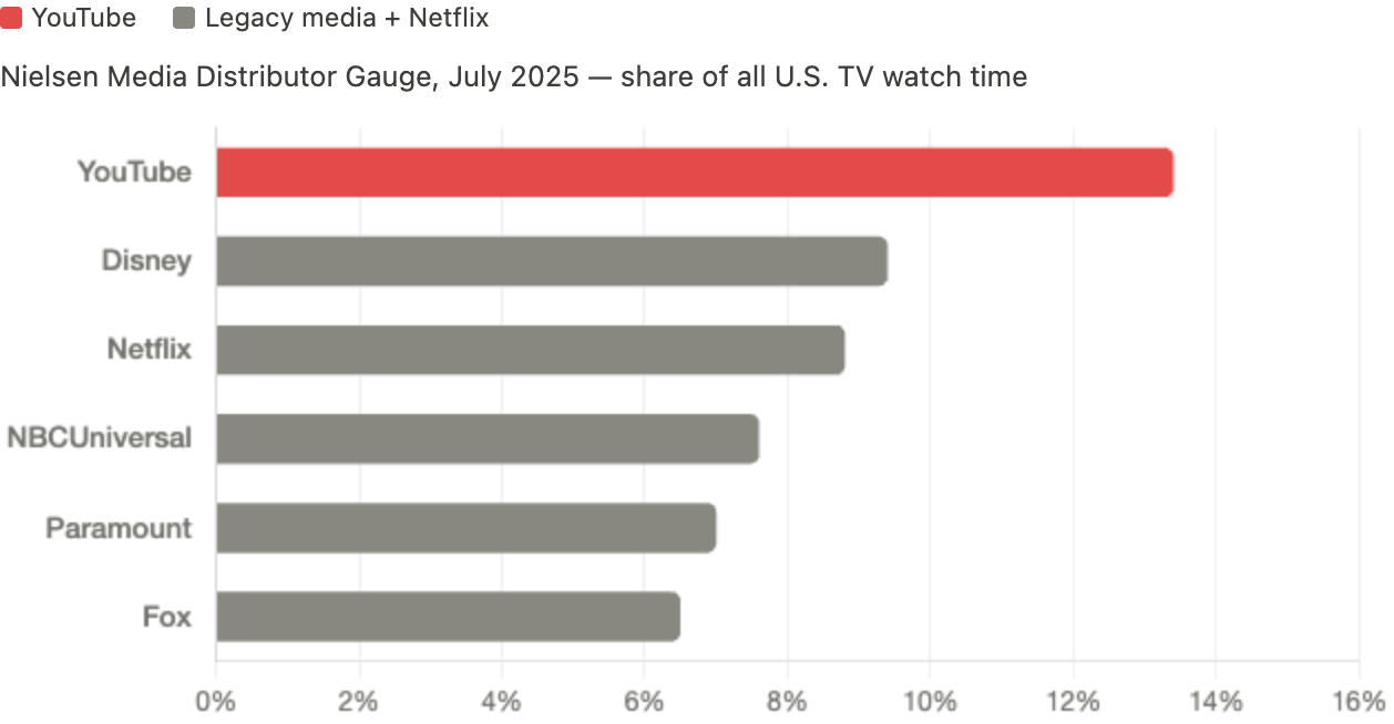 YouTube is television now. Viewers watch more than 1 billion hours of YouTube on TV screens every day. TV has surpassed mobile as the primary device for YouTube viewing in the U.S. Nielsen's April 2025 Media Distributor Gauge showed YouTube capturing 12.4% of all U.S. TV watch time — more than Disney, Paramount, NBCUniversal, or Netflix. By July 2025, that share hit 13.4%. Channels earning six figures or more from TV-screen revenue grew over 45% year over year. YouTube is preparing creators for television behavior, and that shift opens the door for new packaging layers on top.