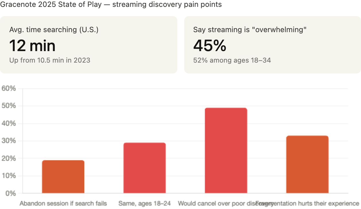Discovery is broken. Gracenote's 2025 State of Play report found that 19% of viewers abandon a session entirely if they can't find something to watch, and that number jumps to 29% among 18-to-24-year-olds. Nearly half said they'd cancel a streaming service because finding content is too hard. American viewers now spend 12 minutes searching before they start watching, up from 10.5 in 2023. And 45% of all streaming users describe the experience as "overwhelming." Access to content stopped being the problem years ago. Navigation cost is the problem now. Choice has become friction, and a better container creates value even when the underlying content is free.